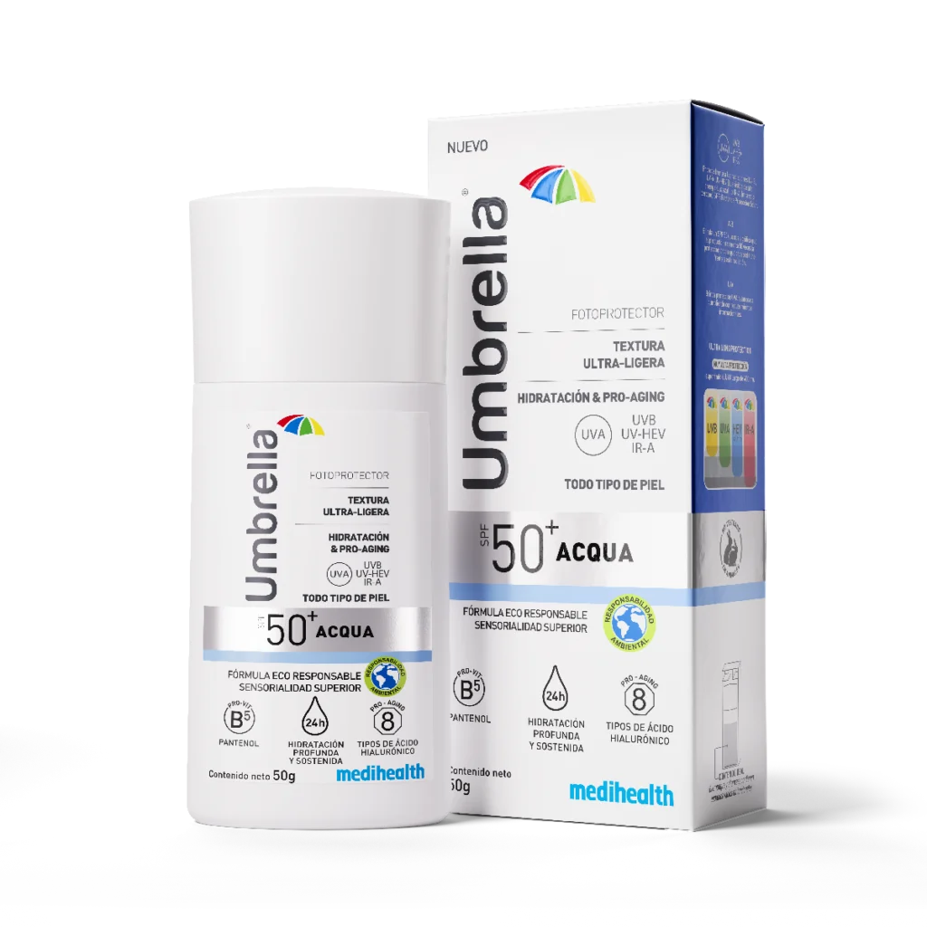Umbrella Aqua es un fotoprotector facial con una fórmula ultrafluida y de rápida absorción, diseñada para quienes buscan un bloqueador solar que proteja sin dejar rastro.